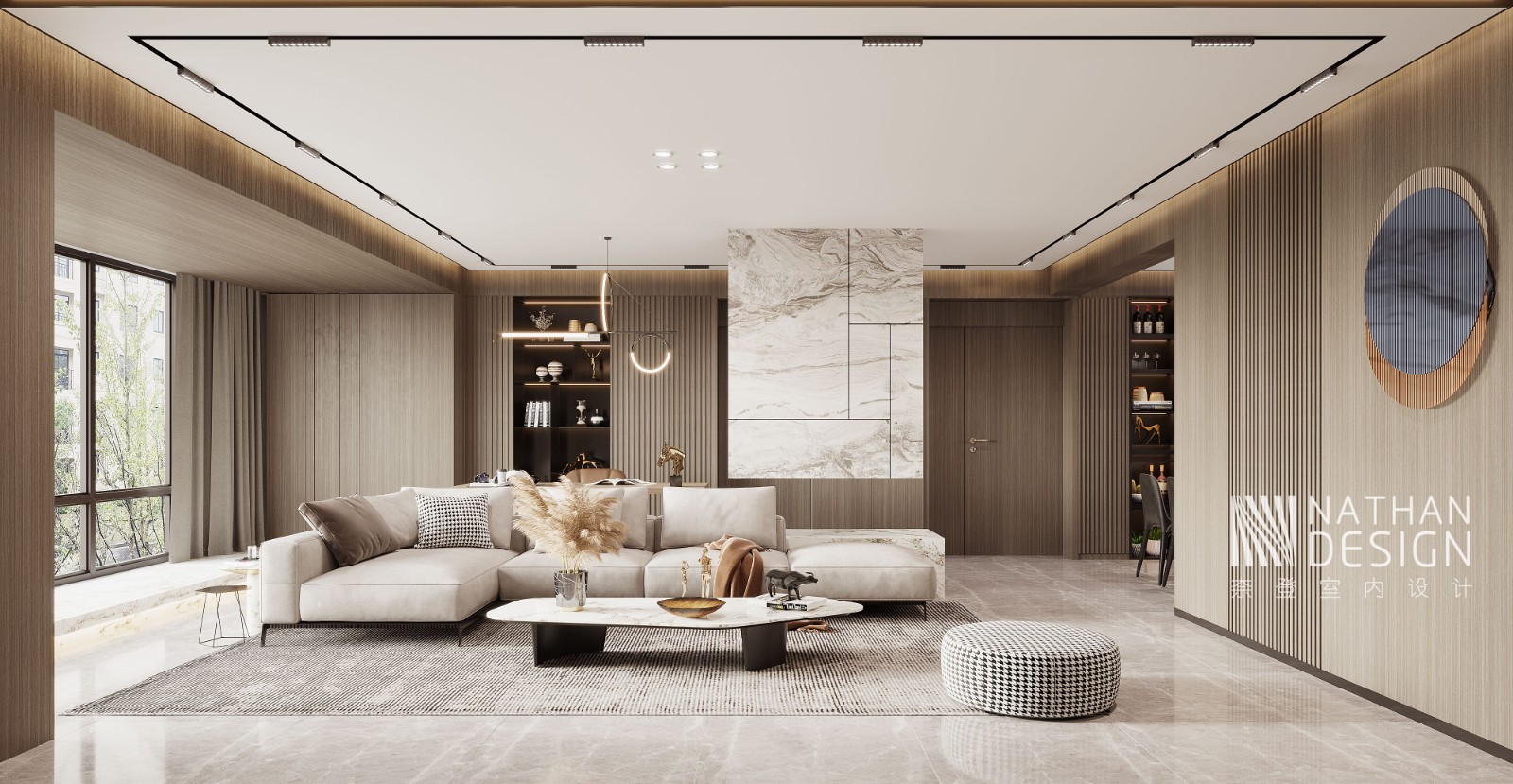 整个以天然石材携手木色饰面为主基调,融入了别具一格的陈设美学,自然、光影与空间交相融汇,从静谧中感受视觉与精神的心之所向。