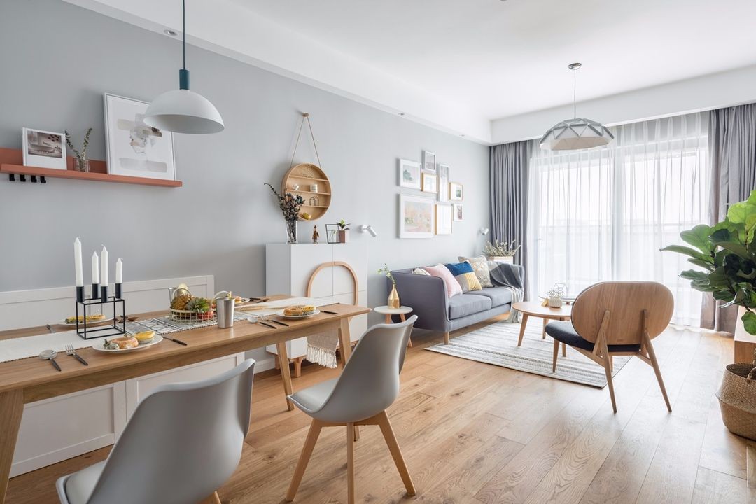 以白色和原木色打底,搭配深深浅浅的灰色穿插在空间里,通过抱枕和挂画的色彩及几何图案点亮空间表情,不多不少,恰到好处。