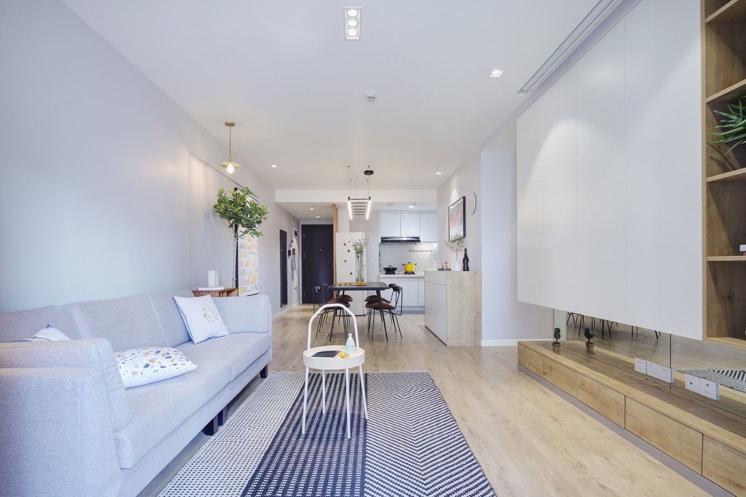 客厅取消了传统的电视背景墙的形式,投影+转角收纳柜,在实用的基础上兼顾对美的考究。