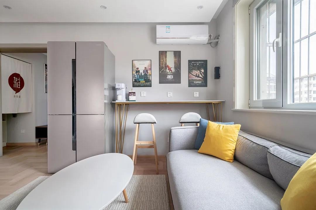 步过玄关,客厅给人一种“忽如一夜春风来,千树万树梨花开”的视觉冲击,整体背景颜色为灰色,搭配黄色、蓝色,颜色在客厅内部跳跃。