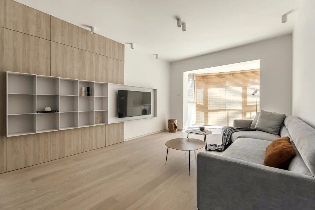 原本客厅是没有任何储物的, 还有两扇房门,视觉比较混乱。 设计师新增加了8组储物柜, 还将所有柜门与房门全部隐藏起来, 整体感更强,看上去非常大气。