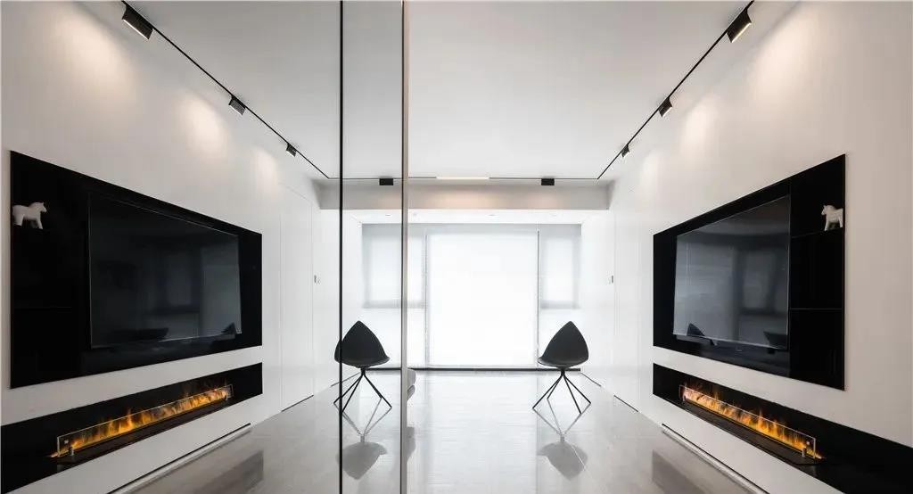 镜面的运用是空间的放大镜,视觉感极好,客厅照明都是以辅助光源为主。顶上的磁吸灯背景墙的暗藏灯带。