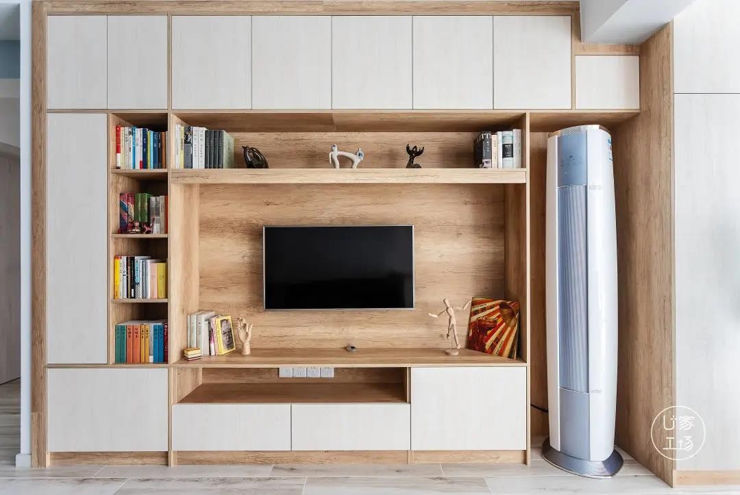 储物功能强大的定制电视柜,满满的储物柜让家中杂物全都能归置得当。U家工场定制柜体的强大除了超高颜值还在于对尺寸上的精确拿捏,完美嵌入立式空调不浪费1㎡空间。