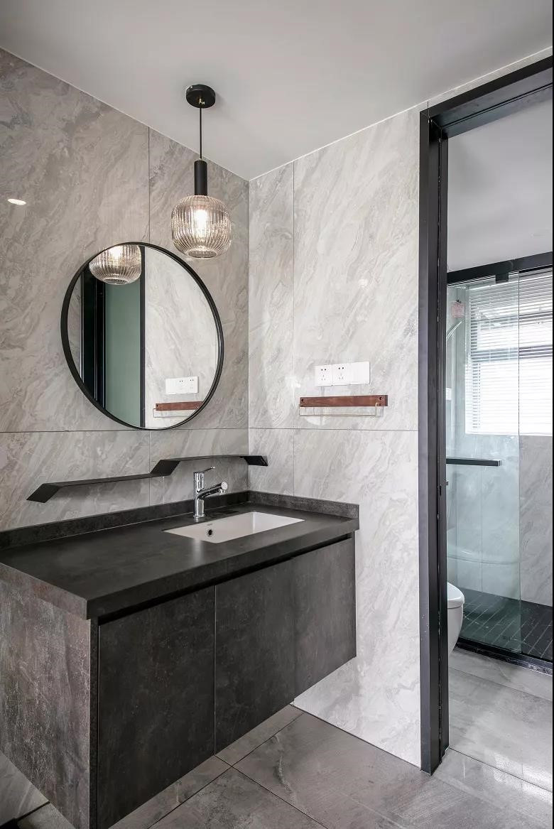 湖色地面与墙面,结合一个灰色洗手盆柜,还有一面黑框的小圆镜、一盏吊灯,在高冷的灰度空间里,布置出了一种小资优雅的空间感。