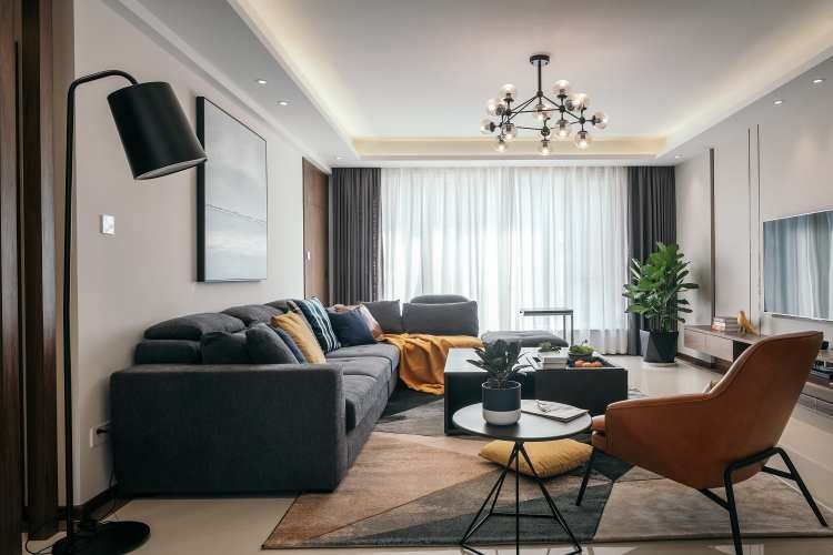 奶茶色系艺术涂料的自然质感,铺满了整个客厅,温柔的气息荡漾而来。