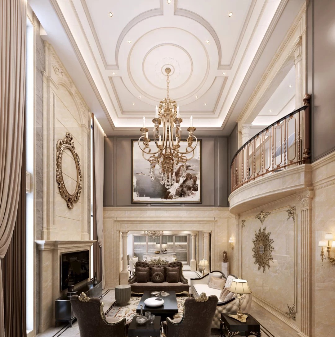 客厅做了中空设计,使二层于一层连接在一起,高吊灯的设计使空间看起来不空洞。