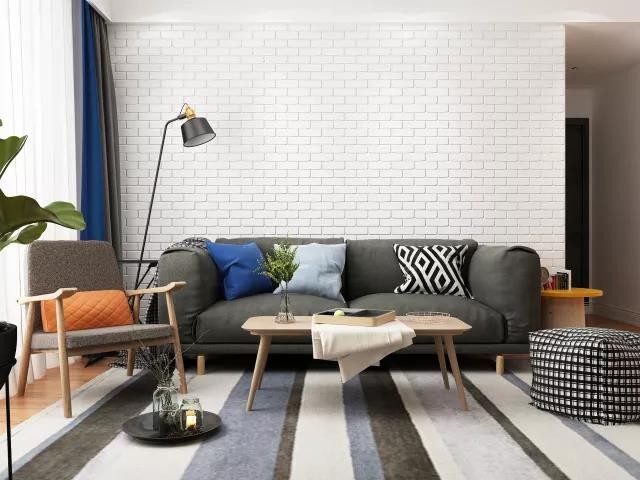 ▲客厅 客厅是完全按照C老师的喜好设计的,文艺清新范儿。 接近灰色的墨绿沙发和大面积文化砖墙白墙,以及含有同色条纹的地毯,奠定了客厅宁静的基础。 干净利落的家具线条,搭配细腿的沙发,细腿单人椅子,以及细腿茶几,让客厅显得不笨重。