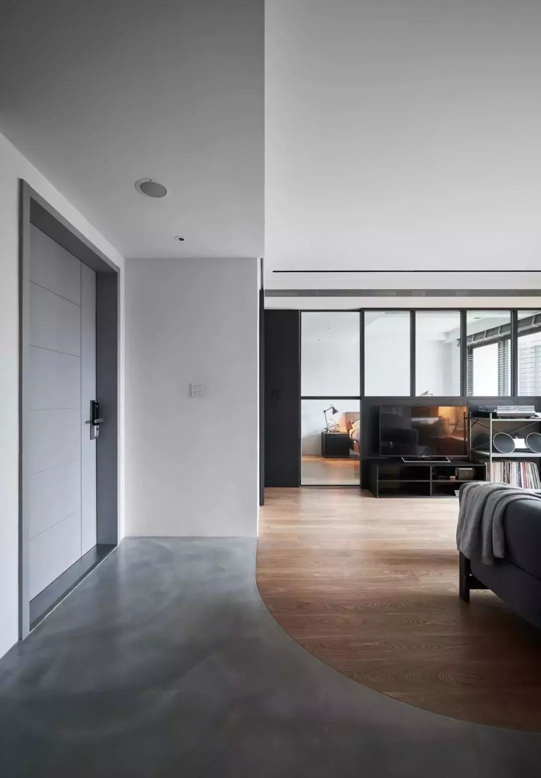 玄关灰色地砖+客厅木地板的搭配,中间以弧线过度的设计,显得简洁而又雅致。
