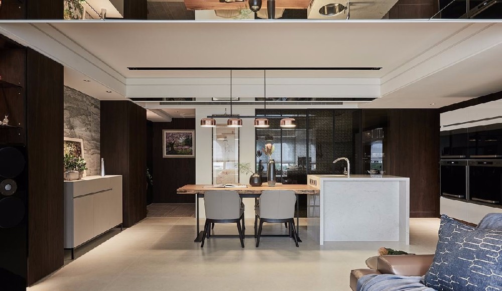 由于原始隔间配置不当造成阻光,让厅区採光不足显得阴暗压迫,于是将客餐厨置于同轴线上,随著恣意流动的自然光,公领域一气呵成机能连成一线,全然开放的中岛式餐厅成为有助于凝聚情感的交谊中心,迎来明亮开阔的生活场域。