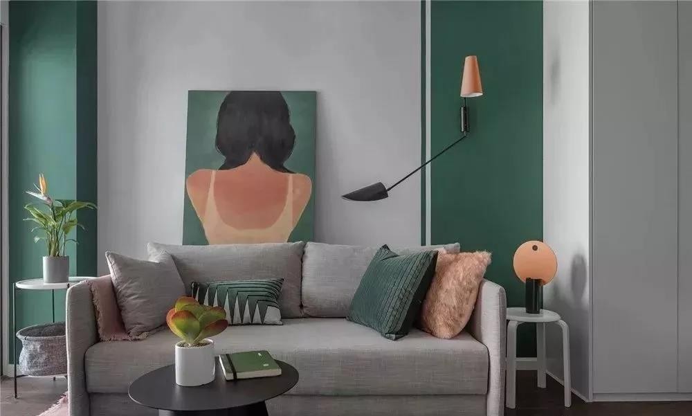 客厅,墨绿色在沙发背景墙左右对称的同时,又具备各自独特的设计感。