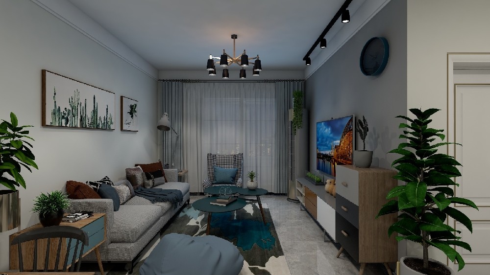 户型为两室两厅一厨一卫,客厅空间以灰色为主,现代感强;客厅空间颜色单薄,在不打破原有和谐色彩的情况下,选用黑白格单人椅丰富视觉;客厅空间有限,选择圆形茶几减少对客厅空间占用的同时,方圆均衡,体现一种简约的和谐感;电视柜选用高低柜设计,减少直线柜的呆板,木色与灰色搭配,层次感更强;酒柜和鞋柜一体的设计,既增加了酒柜的功能需求,又解决了没有鞋柜的困扰。