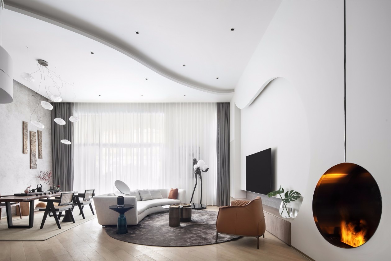 拾级而上,便步入负一层的客厅与茶室。设计师自主设计的圆形壁炉,由笔直纤细的黑色线条延伸牵引,镶嵌在白色墙体之中,像是深邃凝视的明眸,闪着温暖睿智的光彩,让整个空间都充满了温度。屋顶的拱形墙体造型浸润着柔和与情感,这里的曲线首先作为空间的导向发挥作用,成为现代入户区域与古典门厅地带的分界,并拉开了空间曲线交响乐的序幕。