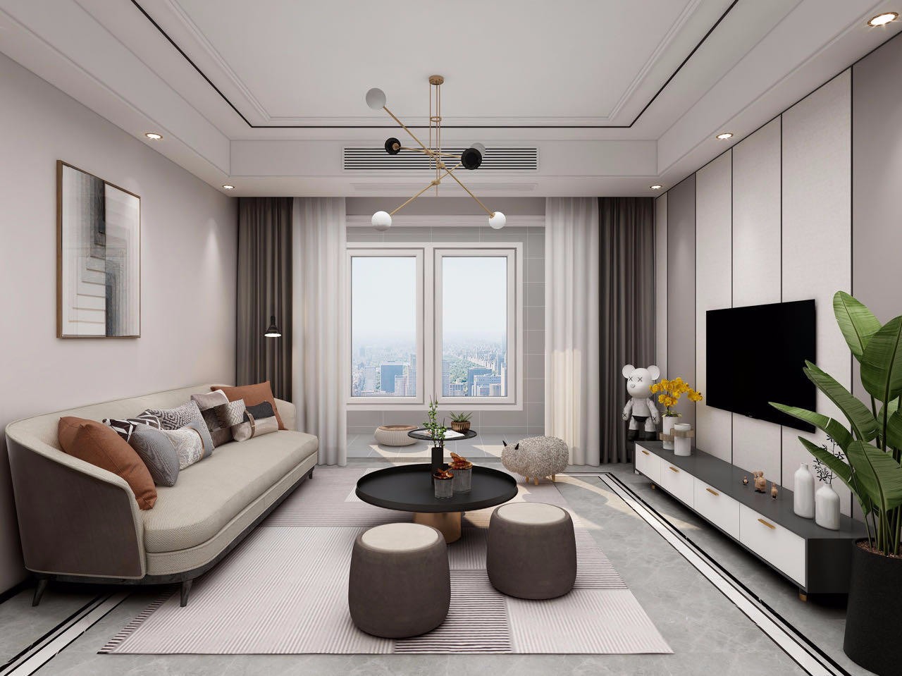 客餐厅以黑白灰为主,背景做了硬包搭配木线条