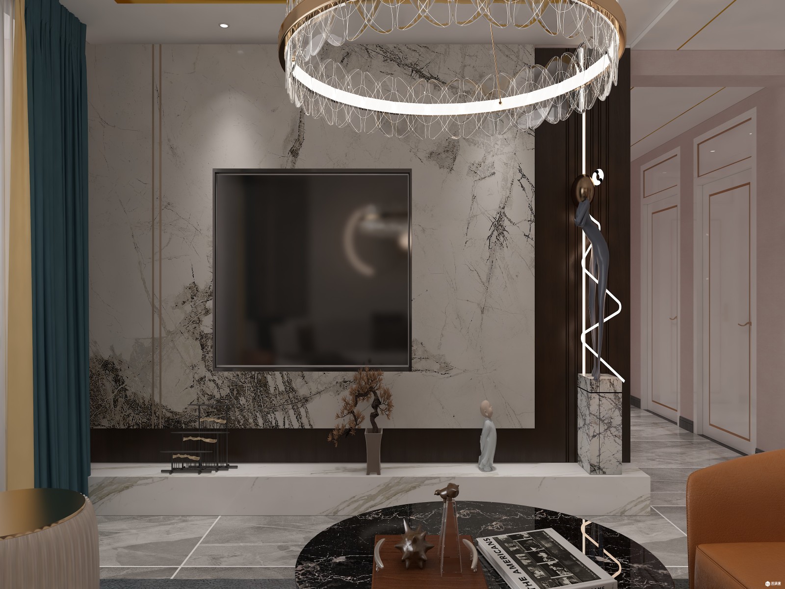 轻奢风格简单大气,电视背景石材加木饰面