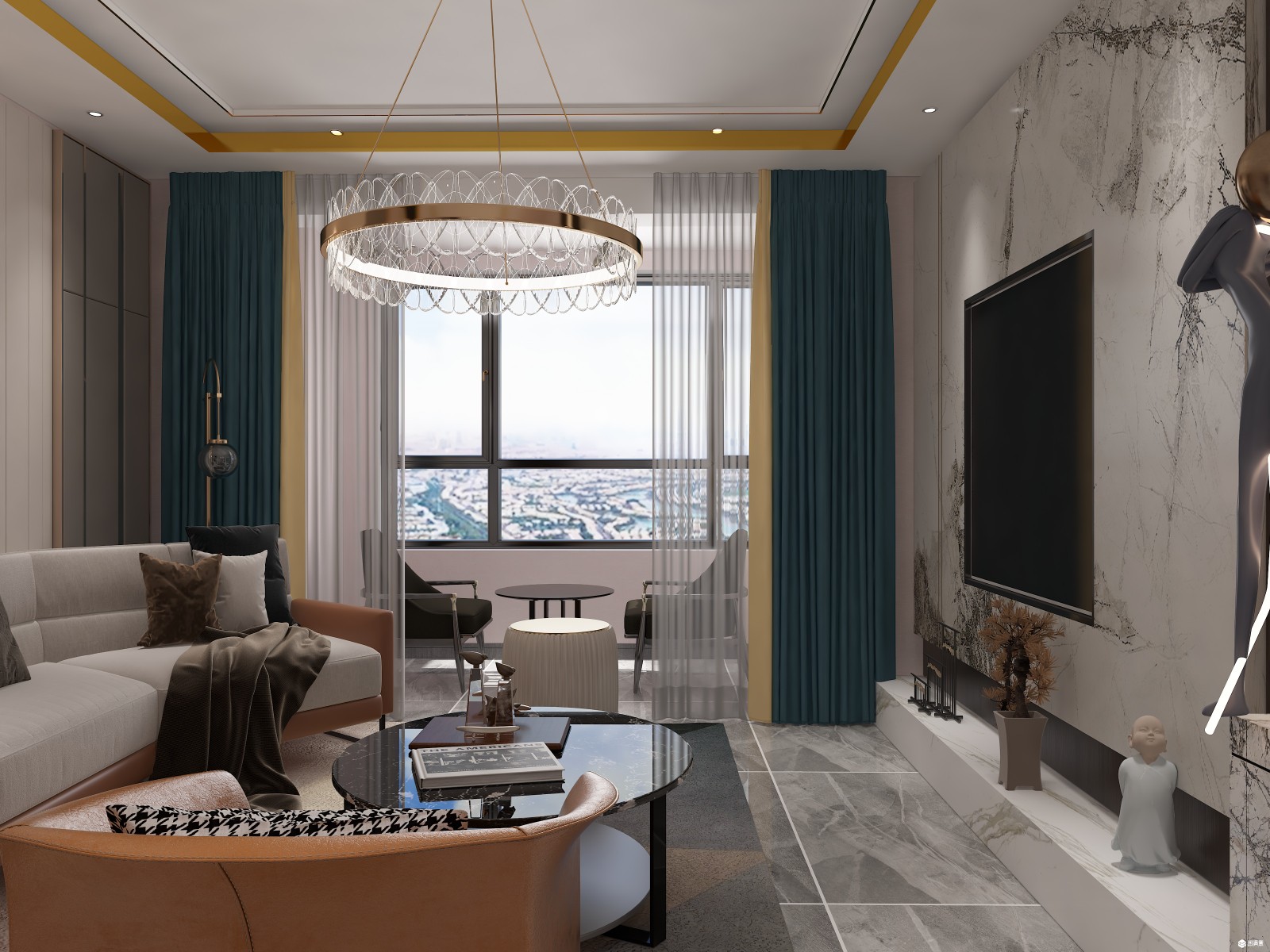 客厅电视墙以石材加木饰面。