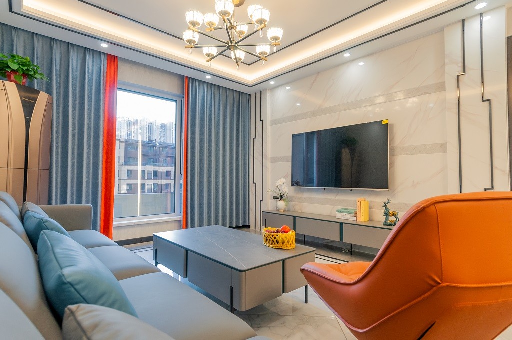 窗帘使用的天蓝色配色,沙发配了一个单人的爱马仕橙