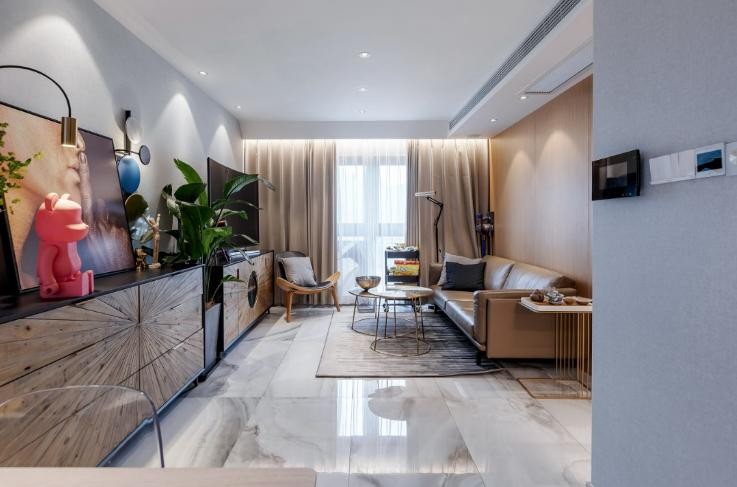 空间给予现代风作基底,引用简单大方的线条,让居家能坐拥清爽放大的效果,并因应着屋主接待亲友的需求,让餐厨、器具与客厅相互串联,不仅达到放大空间效果,也开启交谊互动的可能性,俨然一个使用范围不设限的大客厅。