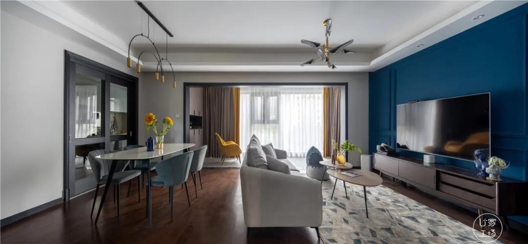 地板与家具以深棕色为主,电视背景墙则刷了宝蓝色乳胶漆,大面积亮色的加入,提升了整个空间内的色彩度。