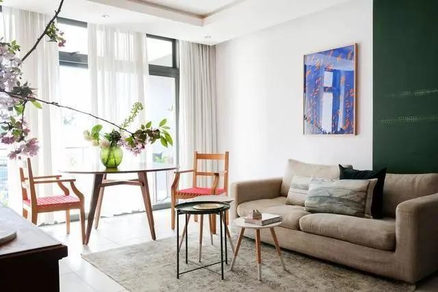 客厅是Lana最喜欢待的地方,柔软的沙发,简约的茶几,半透明的阳台遮光窗帘,温馨又有情调。
