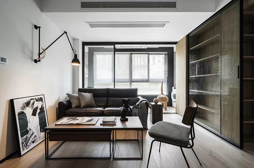 墙面大面积为浅色,沙发家具深,不会有头重脚轻感