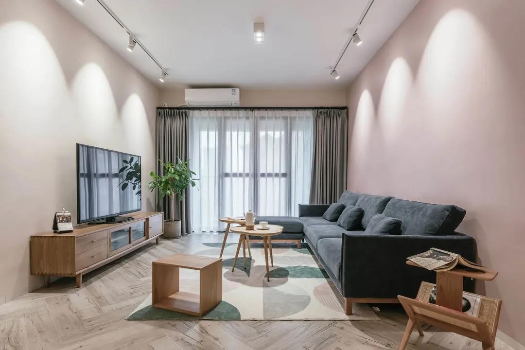 客厅,电视墙没有多余的装饰,涂刷米色乳胶漆,搭配上原木电视柜,自然简洁很耐看。脏粉色沙发墙,搭配上浅灰色沙发,加上无主灯设计,看上去有些文艺小清新。