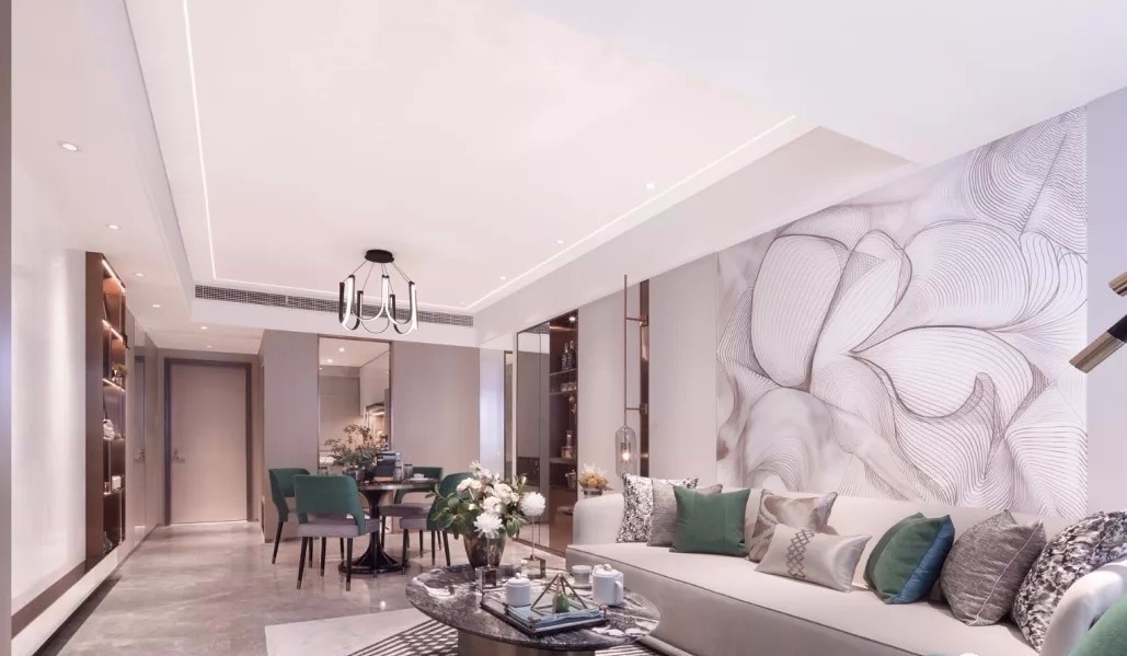 茶几上的铜质装饰、绿色布艺与茶花盆植,轻奢的森系设计,显得清新而又端庄华丽。