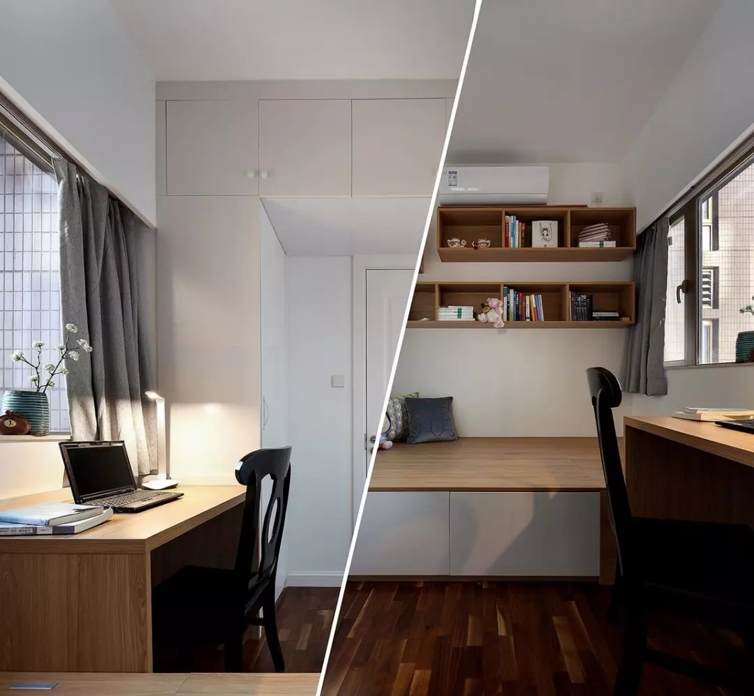 书房内部除了书桌外,还做了一个榻榻米地台,榻榻米的上方做上置物架带来书柜,木色与白色的结合,带来简约自然的感觉。