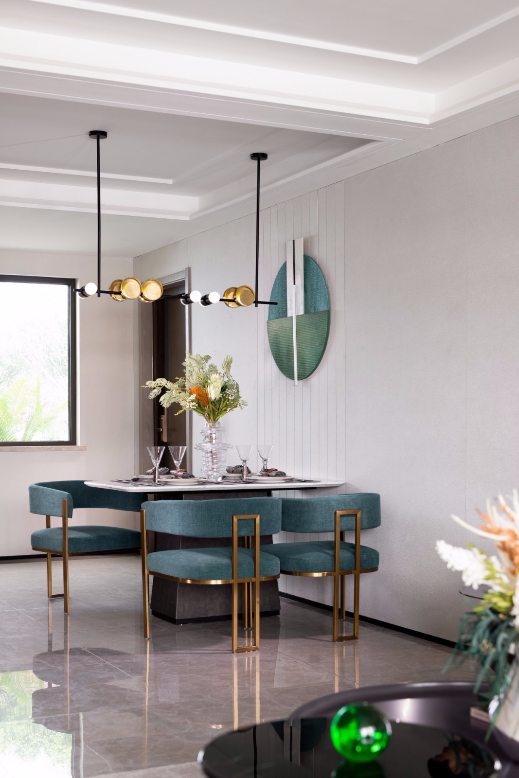 餐厅立体装置挂件、餐椅以及彰显细节的丝带,孔雀绿的搭配既与空间氛围照相辉映,从而达到承上启下的渲染作用。光影的流动协作营造水波流淌的意趣,让人宁静惬意。