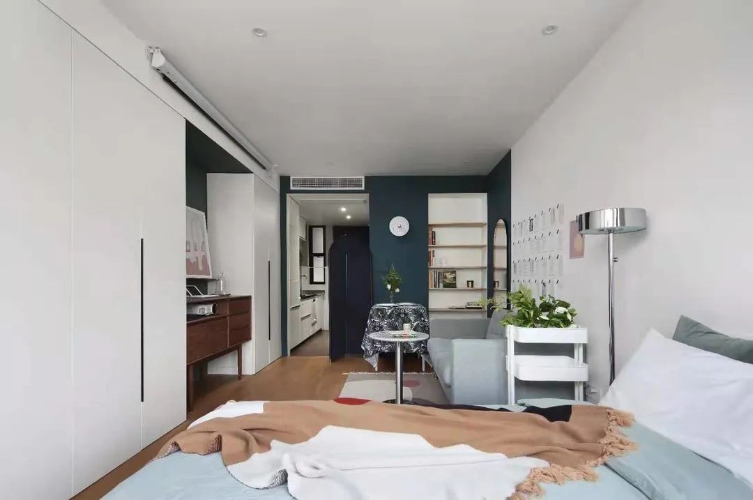 基于屋主一个人居住,大大的卧室区域如今融合了卧房、客厅、餐厅、书房功能。