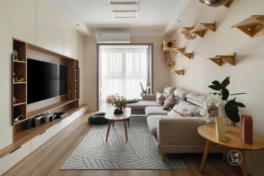 本案屋主是幸福的小俩口,有两只可爱的猫,“我想要的家,是简单却足够实用、有舒适自如的居住氛围,也希望给猫猫留出一些活动空间,打造一个惬意自由的生活环境。”这便是屋主小薇对于新家的期待。 整体户型方正,是比较标准的套二格局,所以在户型上没有做改动。 ①充分开发墙面空间打造柜体,实现收纳扩容 ②拆除阳台移门,与客厅连通提高室内通透度 ③连接厨房与生活阳台,让厨房拥有自然采光