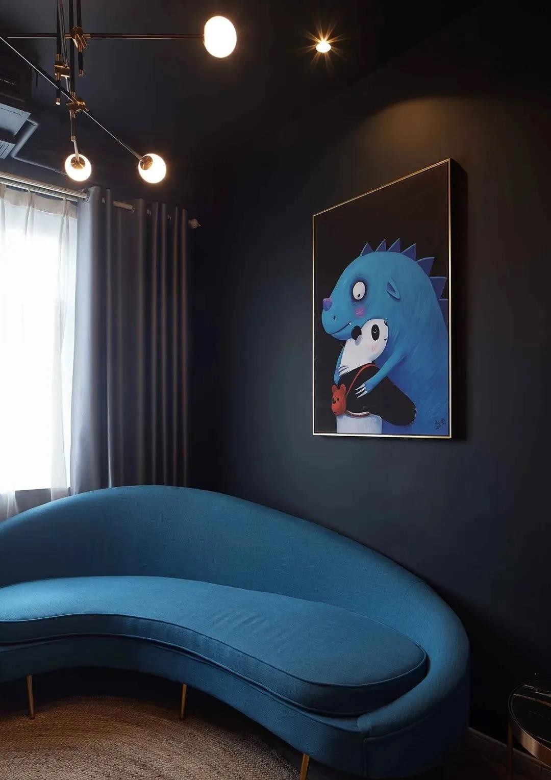 迎面而来的就是浓浓的现代工业气息,整个客厅的墙面都是明度较低的深灰蓝色 神秘深邃。