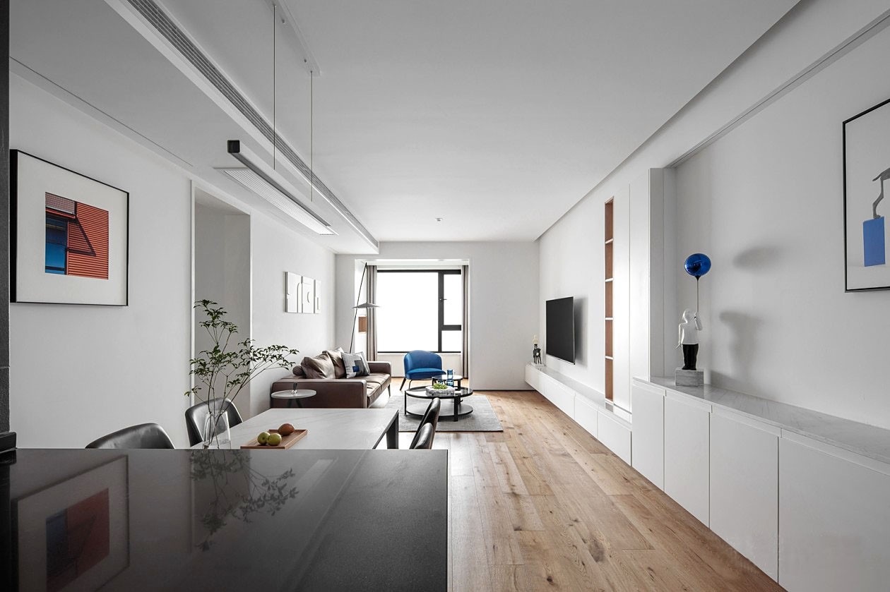 电视柜与玄关柜体连为一条直线,满足了收纳所需的同时在视觉效果上拉长了整个空间感,使之融会贯通。不同尺寸的柜体方便屋主将不同物品依次分类收纳。(在公共区域,大多数极简设计往往会造成空间浪费,储物空间会严重不足,所以分别纳入客厅以及客卧的阳台区域,我们也都将其左右设计为隐形储物柜。)