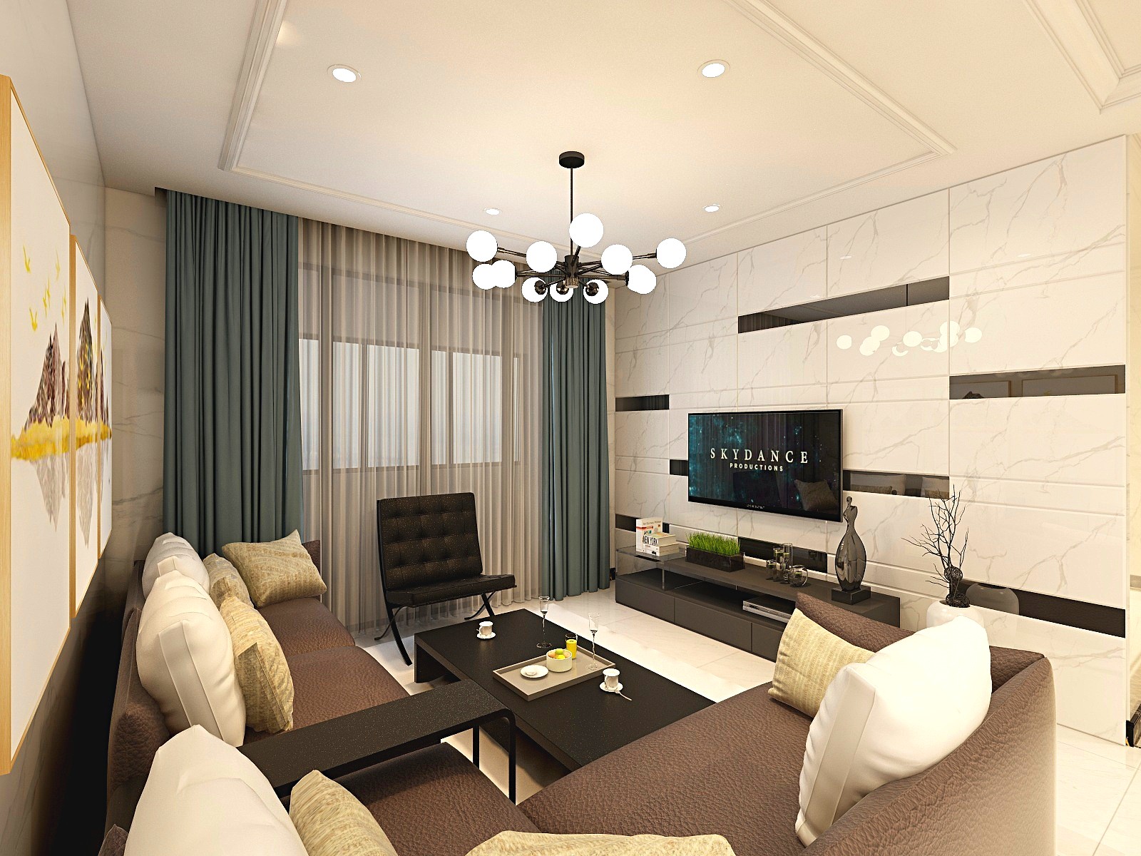 在象牙白色客厅中,加以黑色的条纹进行空间层次感的刻画