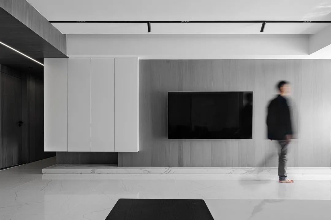 本案以灰白作为空间的主基调,依靠黑色和极少的跳跃色来完成空间的节奏感。我们想表达一个安静且舒适的生活空间,在主材的挑选上我们有意的将色彩的饱和度降低,用大面积的体块来表现预先设定的氛围。