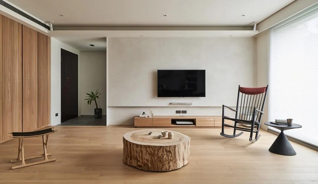 客厅,大面积留白搭配原木材质,大面积落地窗引入充沛采光,看上去更加宽敞明亮。放弃了传统的沙发+茶几的组合,留出了更多的活动空间。
