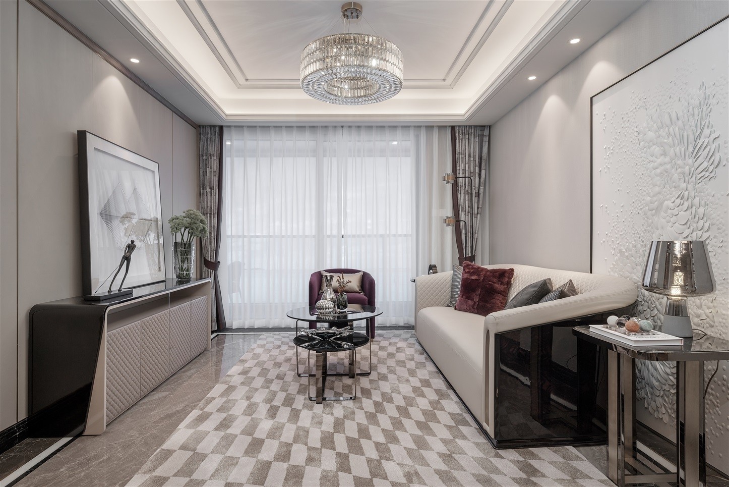 客厅采用Cartier近期主打的深红色与灰为主色调,挑选银器作为提亮空间的点睛之笔,三种颜色的融合,将奢华与雅致完美结合。