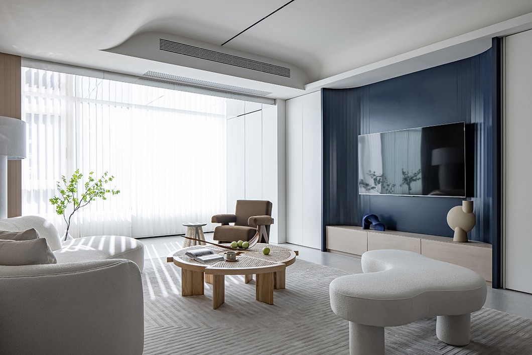 客厅:电视柜造型与鞋柜、岛台相呼应,采用了业主喜欢的绅士蓝作为背景主色,给人一种沉稳雅致的感觉。