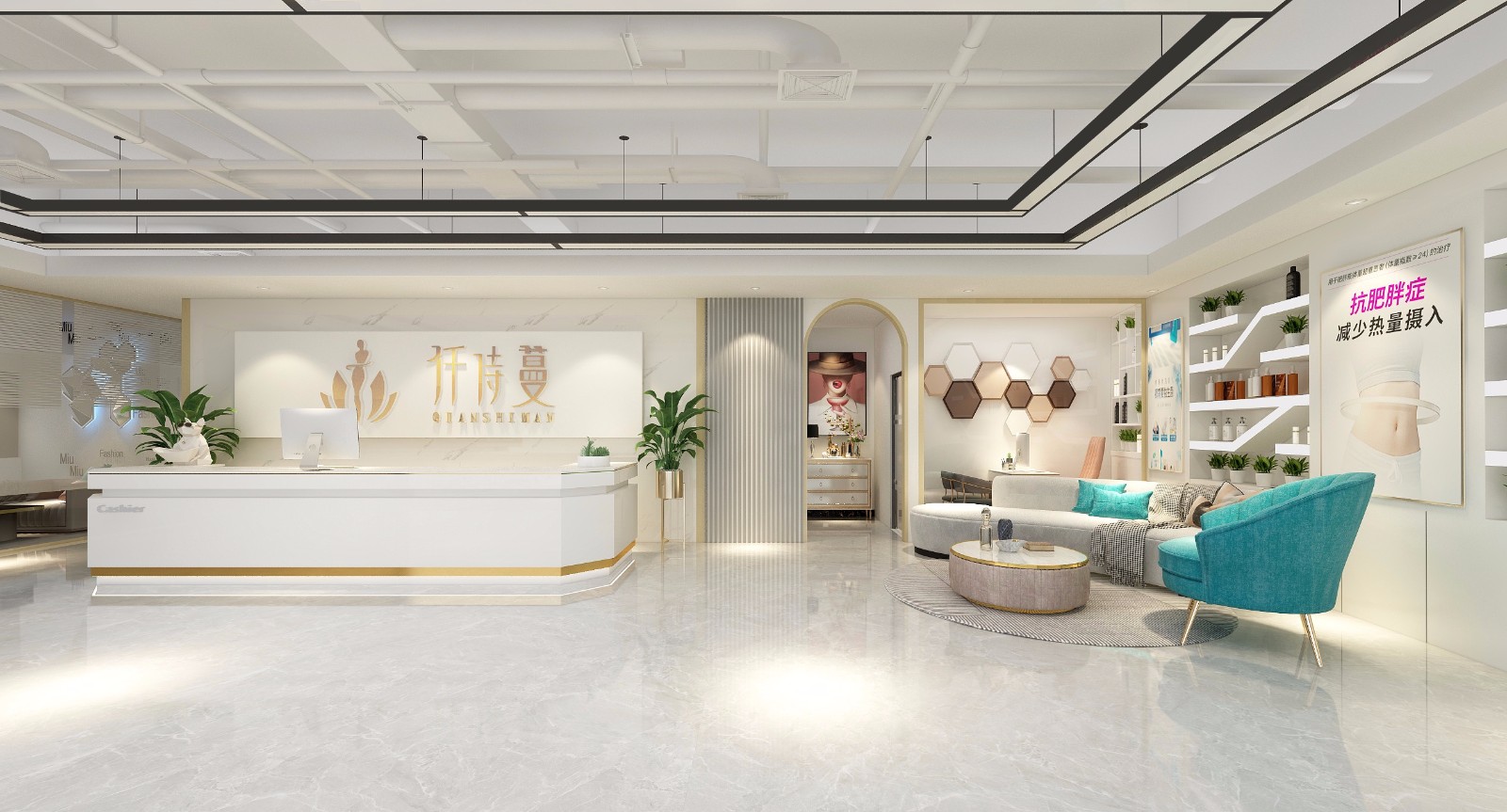 大堂(本案例为350平方的美容馆,整体分为美容室、员工工作区和会客厅,装修风格为现代,运用了白,和多种颜色搭配部分金属元素,营造出现代年轻时尚感让整体空间的气氛活跃起来,让前来美容的客户无论是心灵上还是视觉感受上都得到释放和享受。。-1