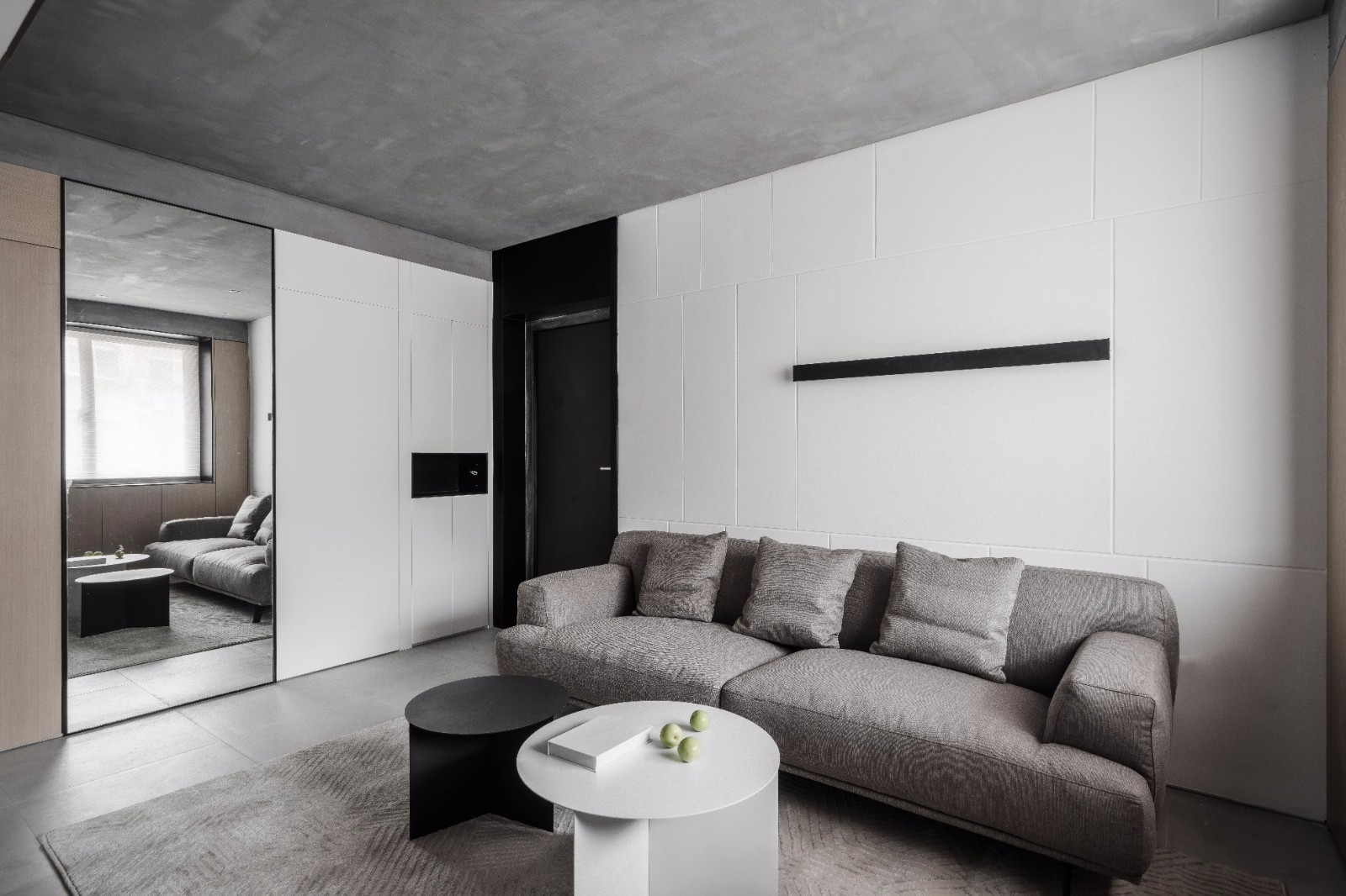 两个房间门隐藏在白色玄关柜和木饰面中,中间的镜面面积做得足够大,有效延伸视觉、扩大空间感。