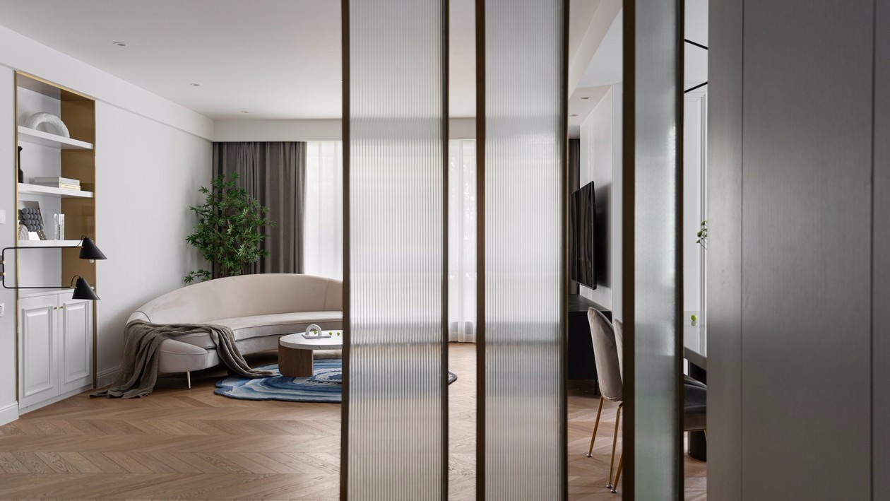 本一览无遗的客厅在分散式长虹玻璃的修饰下,朦胧而婉转,既丰富了视觉感受,又增加玄关的仪式感。