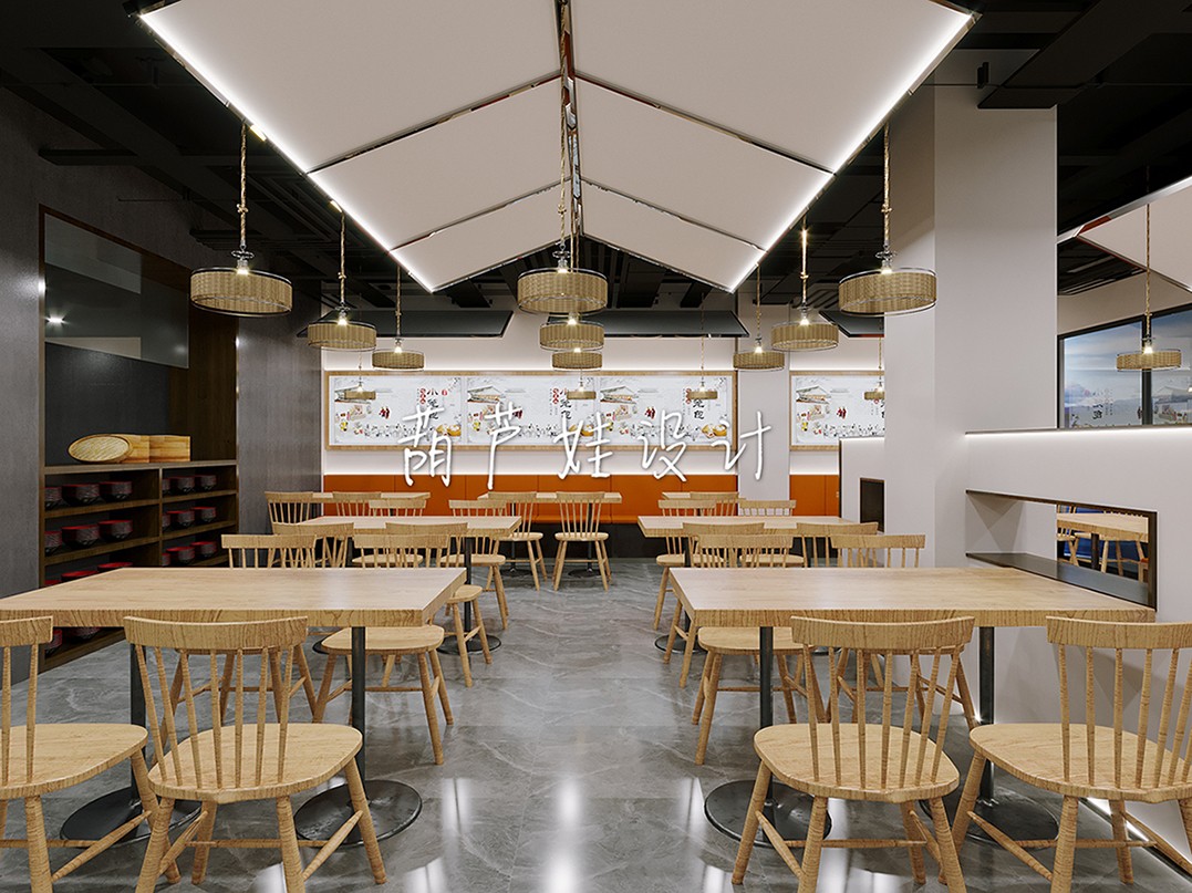 原木桌椅、竹编吊灯、橙黄色软包椅套配上定制款笼包墙纸凸显无锡特色美食的特点。