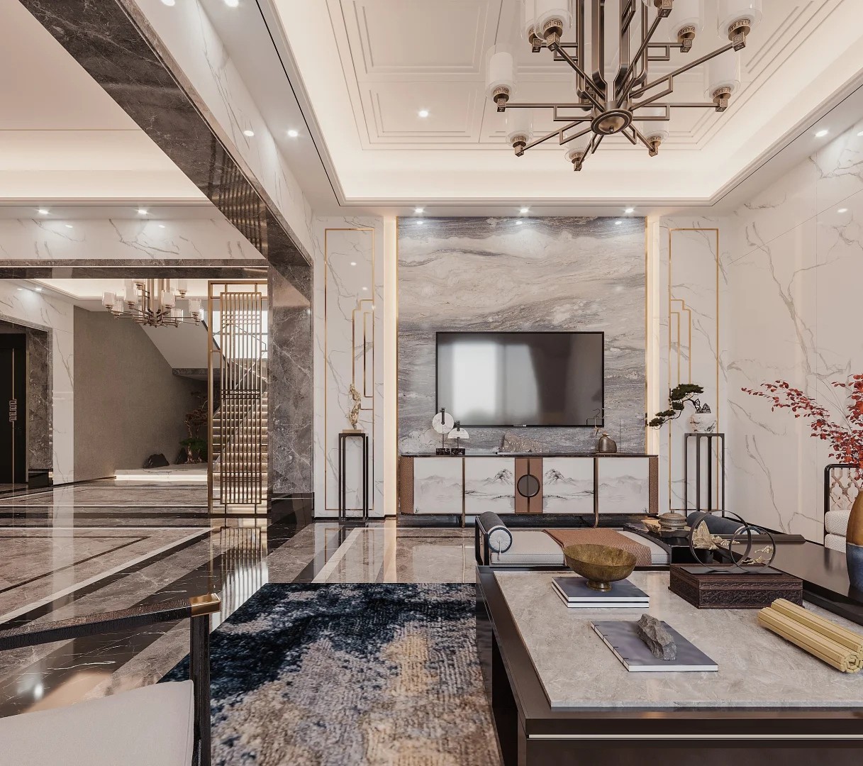 客厅以高档大理石质感和现代风格的线条,搭配中式实木家具,营造了淡雅的气氛,有韵味。