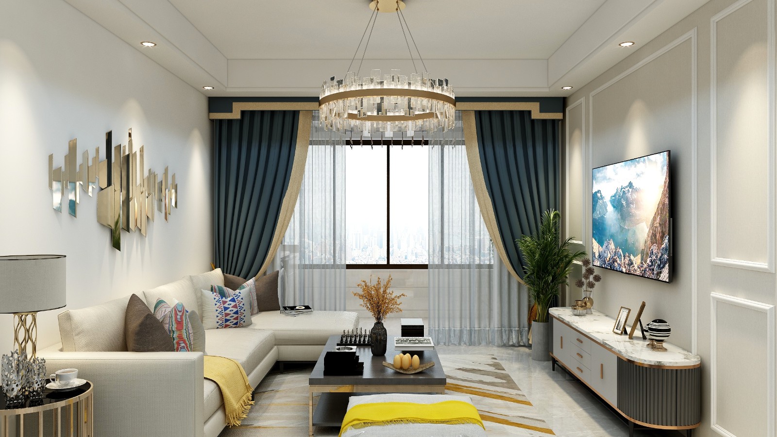 空间通透,纵深感强,电视墙以石膏线框体为装饰,壁布衬底。整体感觉清爽温馨。