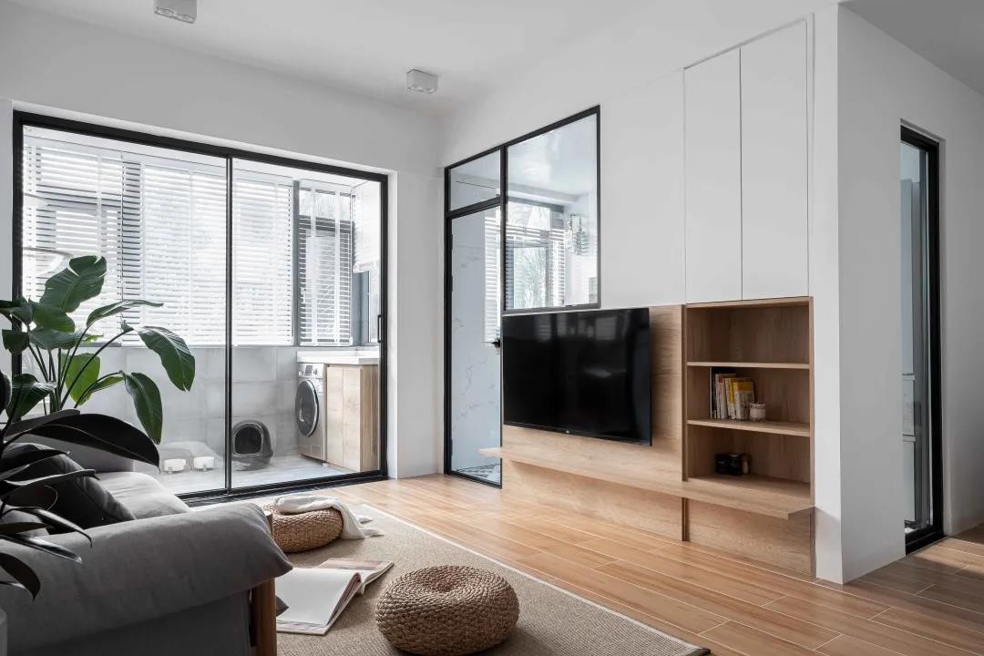 ▲客厅,地面通铺木地板,加上大面积的留白,看上去更加宽敞通透。拆除原有的电视墙,用收纳柜+玻璃隔断代替,既大大增加了收纳,还加强光线的流通。原木+灰色布艺的沙发,铺上自然风的地毯和蒲团,打造无比惬意的家居氛围。