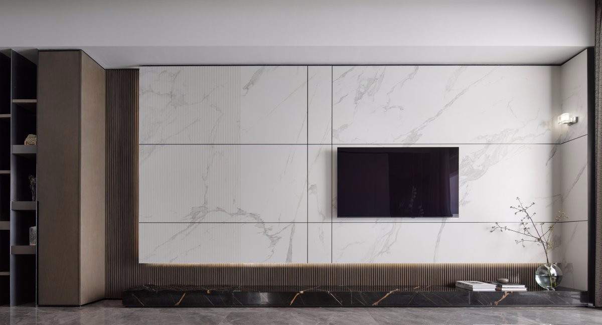 客厅唤醒了关于托斯卡纳大地大理石的记忆,卡拉拉白岩板拉槽和劳伦特黑金水波纹,为电视墙面赋予了全新的优雅意境和纯粹的品质光泽。