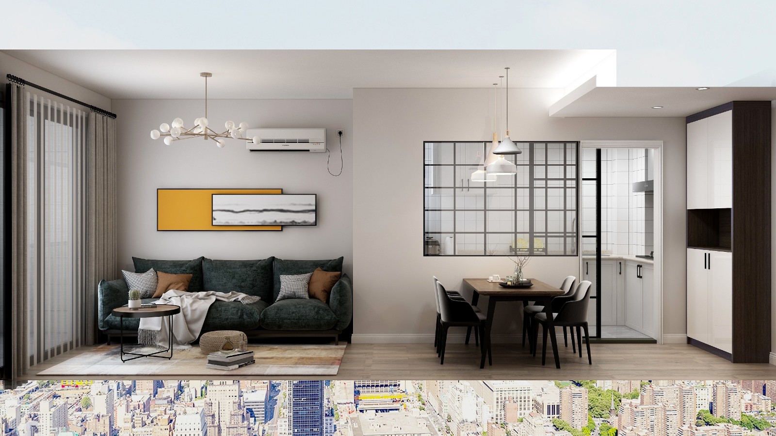 客餐厅餐厅的灰色墙壁搭配黑色的隔断,半开放式的厨房,给人简约又不失设计感。