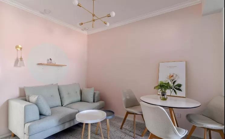 客厅区域藕粉色布艺沙发,搭配高低组合式小茶几,沙发墙上装着搁板架,布置出一个浪漫优雅的空间气质。