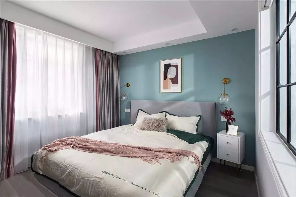 卧室整体的配色是综合了客厅、餐厨空间的配色方案,青蓝色、灰色、粉色和白色结合起来,也不会让人感觉太过杂乱。舍弃一侧的床头柜让卧室更加宽松。