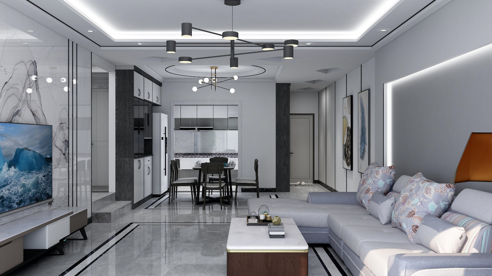 黑白灰配色,周边吊顶辅助光源配合重点光源,整体和谐,干净