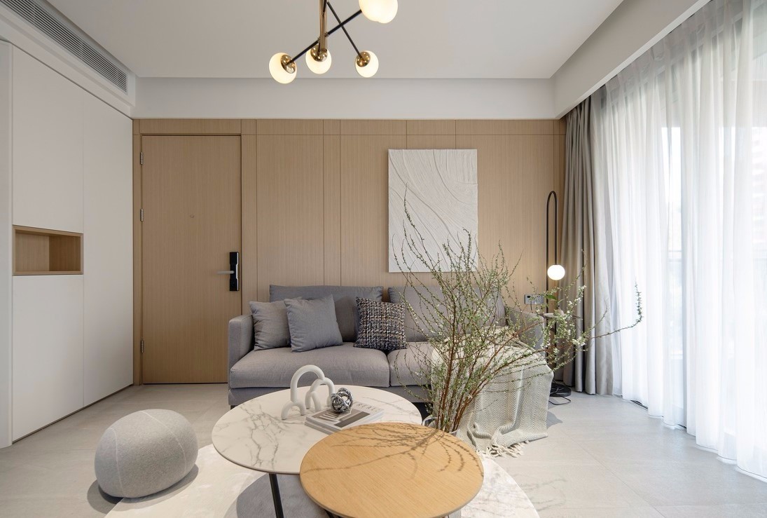 木饰面背景墙将沙发区域包围,包括门的材质保持一致性,让沙发背景墙形成一个整体。
